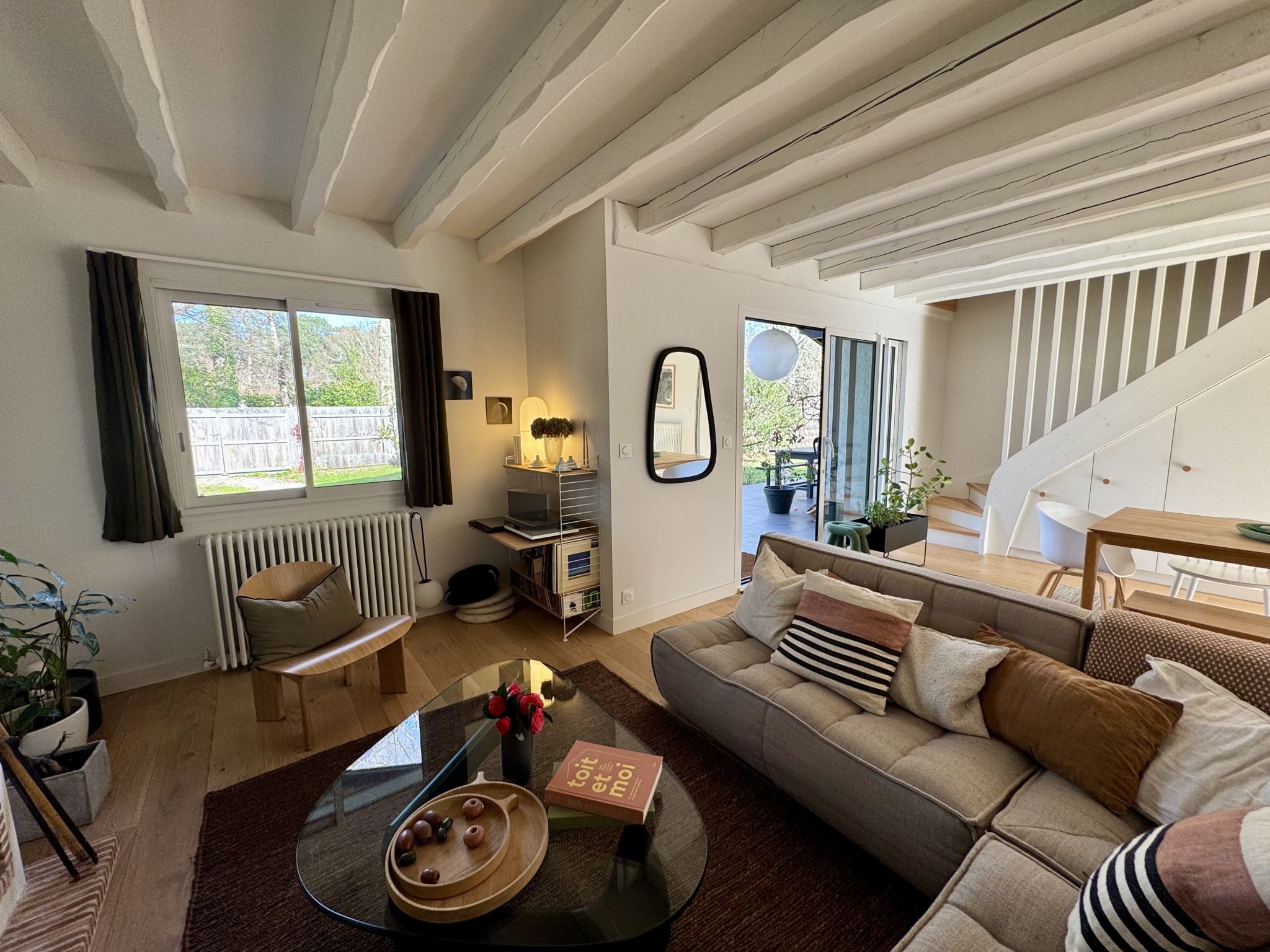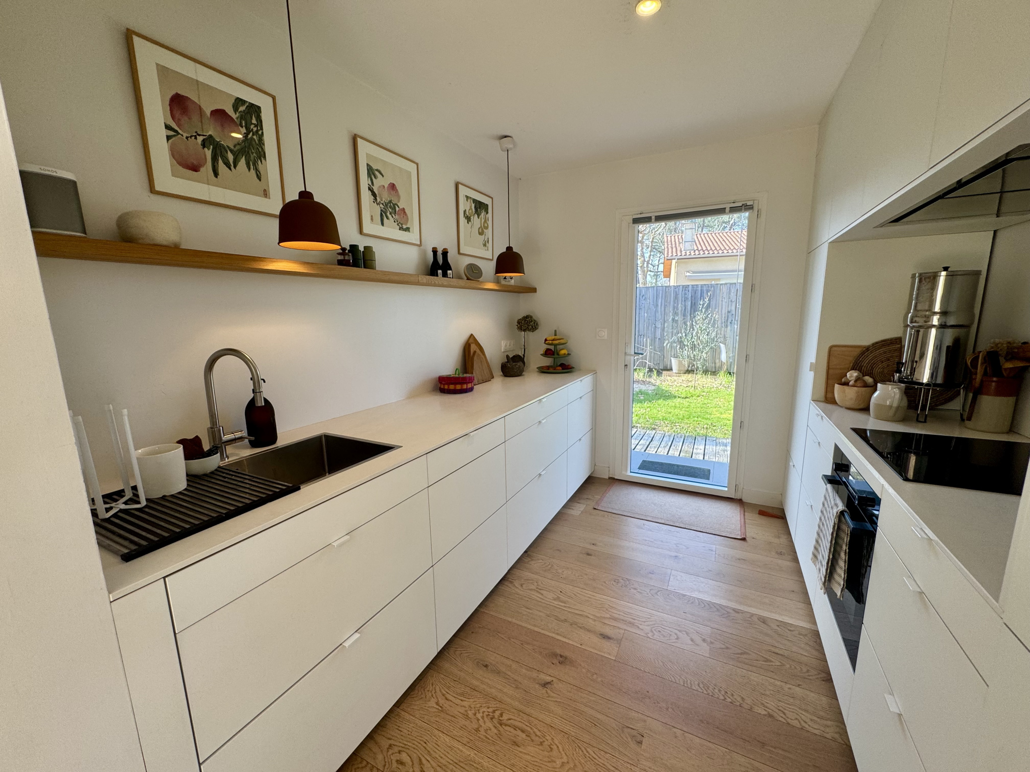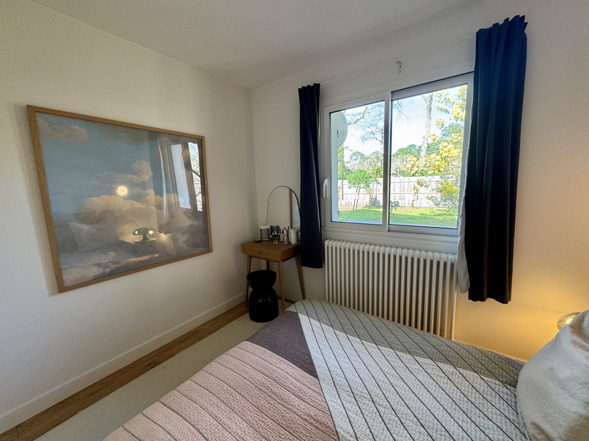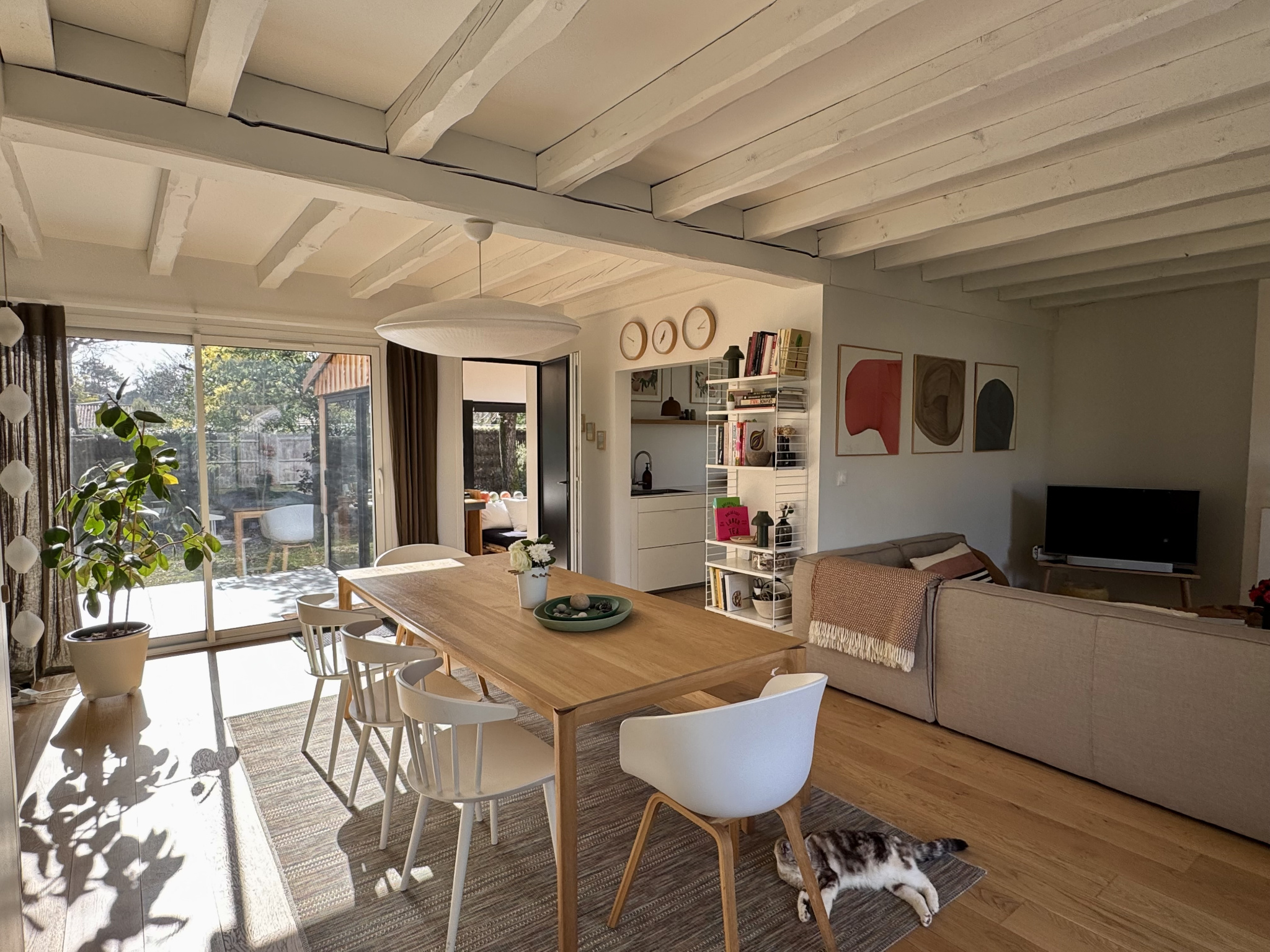 En exclusivité, très belle maison Landaise de 130 m² environ, entièrement rénovée en 2022, sur 2 niveaux avec un jardin arboré de 963 m², située dans un quartier très calme de Lège à proximité du Canal des étangs.