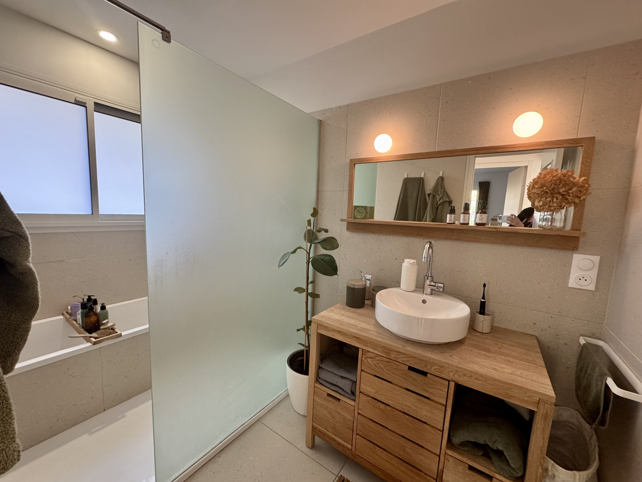 Une grande terrasse couverte permet de profiter de l’extérieur par tous les temps et une douche extérieure utile pour les retours de plage !